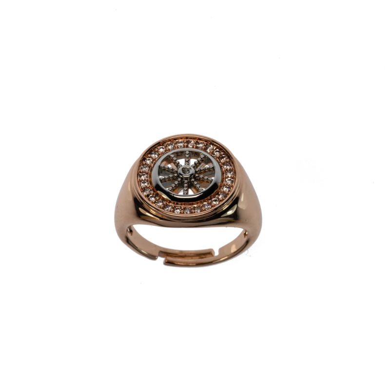 Anello siciliano elegante accessorio frutto dell'artigianato e della tradizione dell'isola. Realizzato in metallo placcato, dal colore oro, bianco o rosato, intarsiato al centro con un elemento tipico siciliano ed  incastonati a pavet zirconi bianchi e colorati si ispira ai simboli cardine della nostra isola come la ruota del carretto, la trinacria e la Sicilia, di cui richiamano cultura e tradizione. La sua forma ricorda gli antichi anelli araldici sempre a rafforzare l'importanza della storia e delle tradizioni.