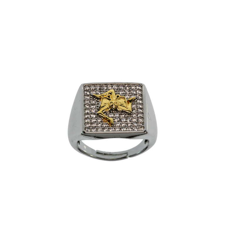 Anello siciliano elegante accessorio frutto dell'artigianato e della tradizione dell'isola. Realizzato in metallo placcato, dal colore oro, bianco o rosato, intarsiato al centro con un elemento tipico siciliano ed incastonati a pavet zirconi bianchi e colorati si ispira ai simboli cardine della nostra isola come la ruota del carretto, la trinacria e la Sicilia, di cui richiamano cultura e tradizione. La sua forma ricorda gli antichi anelli araldici sempre a rafforzare l'importanza della storia e delle tradizioni.