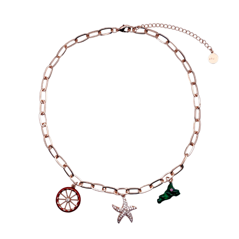 Collana in metallo anallergico con 3 charms: ruota, stella marina, Sicilia.