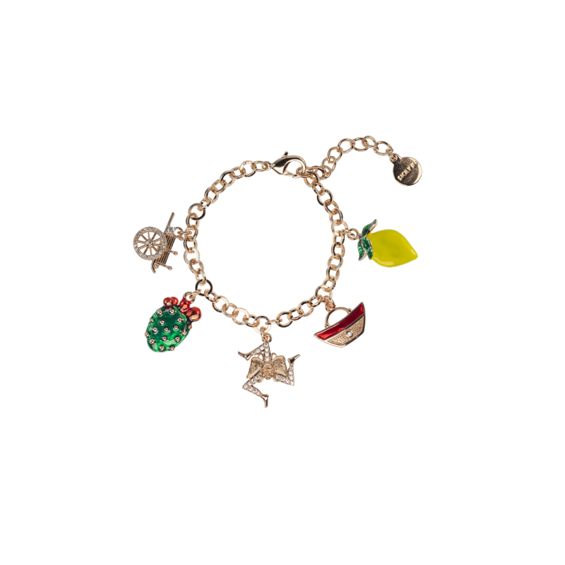 Bracciale siciliano elegante accessorio frutto dell'artigianato e della tradizione dell'isola. Realizzato in metallo placcato, dal colore rosato, con 5 charm siciliani arretto siciliano, coffa, trinacria, fico d'india e limone arricchiti di zirconi bianchi e smaltati di colori che richiamano i colori della retta di Sicilia.